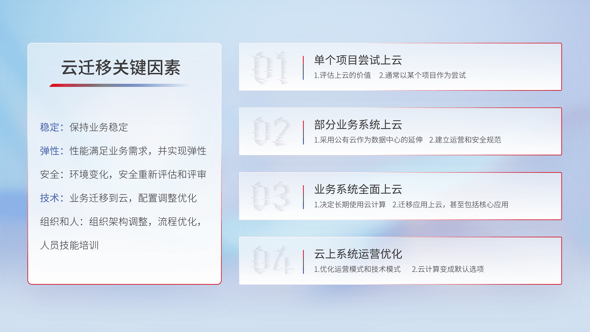 结合实际业务,,,,从规划设计、、云平台选型、、、云原生改造、、数据迁移、、、集成交付,,迁移全过程为客户识别最佳上云路径,,,做好风险识别管理,,设计网络架构、、身份权限、、、安全审计合规、、、、操作审计、、日志审计、、、、监控告警策略、、、、多站点容灾设计等,,对云上基础设施进行整体规划,,提升IT治理水平,,以满足弹性、、高可用、、、高性能的需求。。。